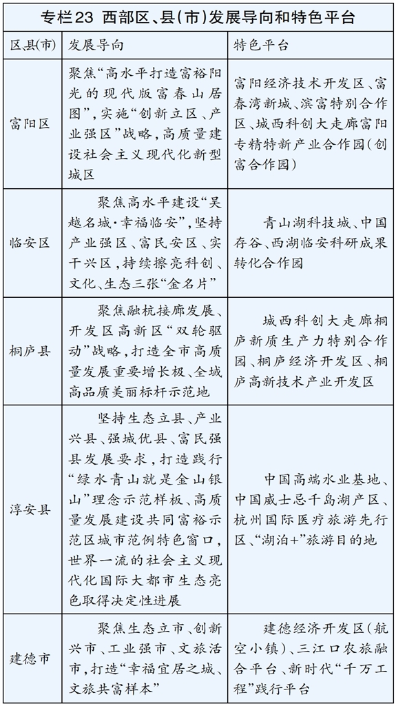 推动西部绿色发展大走廊建设,提升富春江中下游地区联东带西、联城促乡的重要节点功能。支持西部区、县(市)跨越式高质量发展,完善区县(市)协作、联乡结村、“三百帮促”等区域帮扶机制,引导科技、人才、资金等生产要素和产业向西部区、县(市)辐射。升级滨富合作2.0模式,深化西湖临安科研成果转化合作园建设,高质量打造城西科创大走廊桐庐新质生产力特别合作园。完善淳安县“一县一策”长效推进机制,加强淳安特别生态功能区建设,加快发展水产业和旅游业。支持建德打造绿色循环发展高地、和美乡村实践示范。
