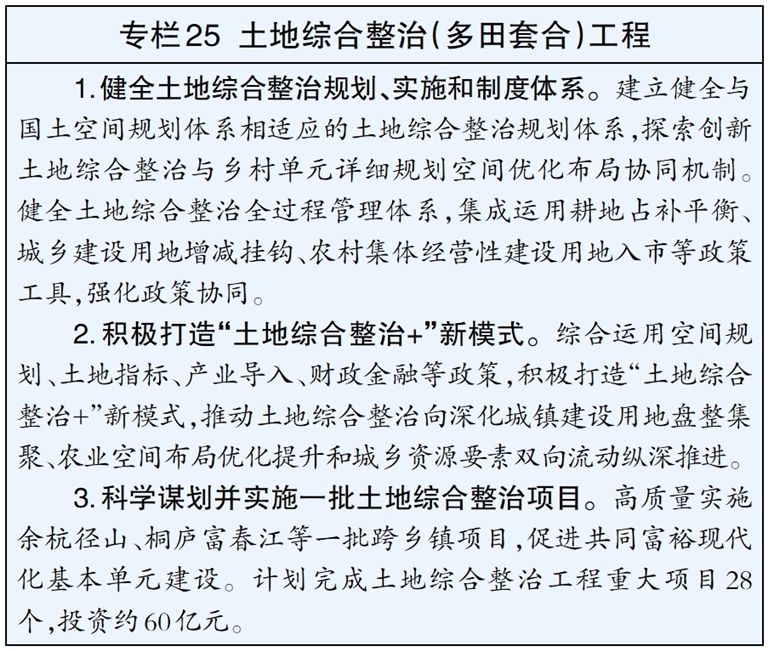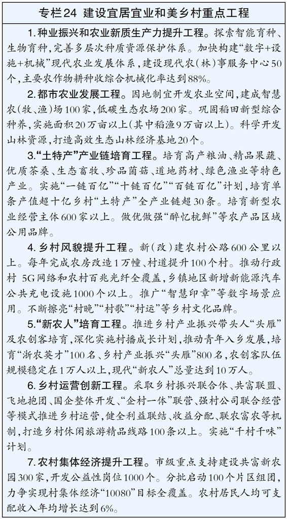 提升发展现代都市农业,构建布局合理、链条完整、高效生态的现代都市农业发展体系。深化农业“双强”行动,加快发展设施农业、智慧农业、生态农业、特色农业和现代农业服务业,全域布局建设现代农(林)事服务中心。建设一批数字农业工厂、未来农场,打造农业新质生产力高地。大力发展山林经济和新型综合种养,推动“土特产富”全链发展。支持农产品区域公用品牌建设,扩大绿优农产品生产,发展多层次农业保险。落实耕地保护和粮食安全责任制,深入实施土地综合整治(多田套合)工程,做好粮食和重要农产品稳产保供,“多田套合”率达到100%。
