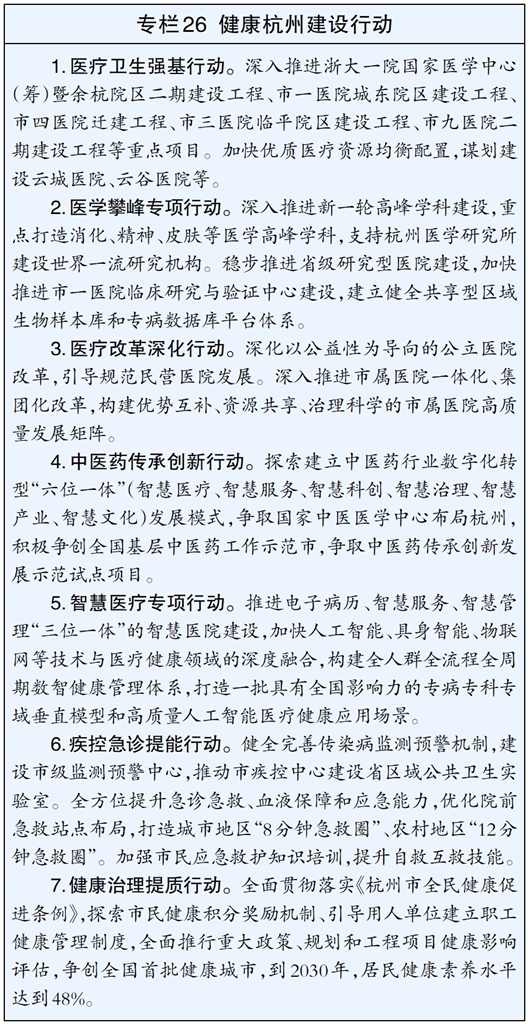 实施健康优先发展战略,深化现代化健康治理和公共卫生服务,完善全民健康促进政策体系,健全医疗、医保、医药协同发展和治理机制。推进优质医疗资源下沉,推动县域医共体建设、城市医疗集团网格化布局、“固定+流动”诊疗服务全覆盖,深化医疗人才“县乡村一体化”改革,构建基层医疗卫生服务标杆体系。深化家庭医生签约服务,推动“家医智能体”2.0迭代。优化中医药特色服务,深入推进国家中医药传承创新发展试验区建设和国家儿童青少年脊柱侧弯中医药干预试点,基本建成中医药现代化先行市。加强精神卫生和心理健康服务,完善慢性病综合防控示范区建设,强化重点疾病早筛早诊早治。