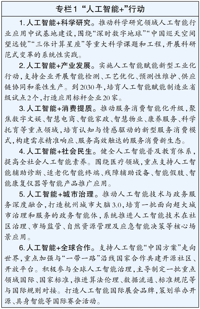 推进人工智能与科学研究、产业发展、消费提质、社会民生、城市治理、全球合作等领域融合发展,推动人工智能产业化、产品化。推进医疗领域行业应用中试基地建设,争创相关领域行业应用中试基地。面向科学研究,支持高校和科研机构建设“数据+模型+设施”的AI科研平台,加速推动科研范式变革实践。面向医疗、教育、文化、康养、体育等民生领域,推进人工智能产品的合作创新,支持在杭首用推广。