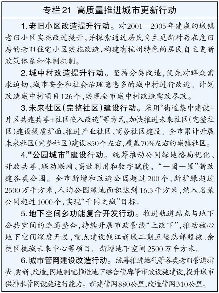 健全城市体检与城市更新一体化推进机制,构建可持续的城市更新模式,完善政策标准体系,实施城市更新重点片区不少于30个。以城市更新激活存量资源,推动老旧厂区(园区)、老旧街区、传统商圈、低效楼宇等更新。统筹历史城区有机更新和新建区域合理开发,守护城市独特的历史文脉、人文地理、自然景观。推动钱塘江、京杭大运河等标志性水岸绿带活化提升,深化四级公园体系建设,推进绿道贯通与品质提升,织密社区级绿道网络。