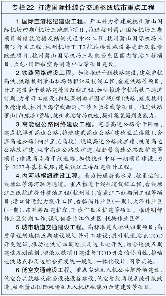 推动杭州萧山国际机场打造区位门户复合型国际航空枢纽,积极争取更多航线航班时刻资源,重点增加共建“一带一路”沿线国家、“金砖国家”主要城市航班数量,持续加密全货机航线。加快杭州临空经济示范区建设。提升杭州铁水物流运输国际连通度,积极推进钱塘江、京杭运河等干线航道提升工程,推进铁路综合货运枢纽建设,强化与宁波舟山港、上海港的高效衔接。