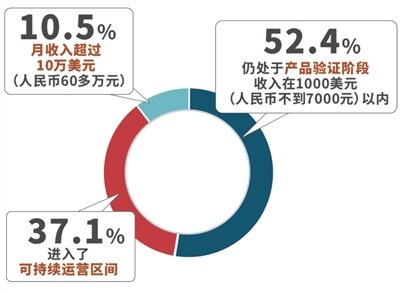 调研样本中,52.4%的受访者仍然处于产品验证阶段,收入在1000美元(人民币不到7000元)以内;37.1%的进入了可持续运营区间;10.5%的月收入超过10万美元(人民币60多万元)。