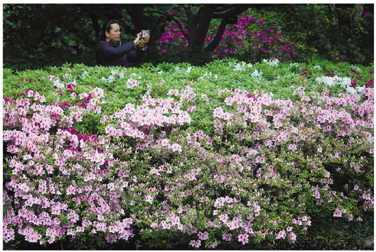 此次花展的重头戏,是地栽杜鹃自然观赏区。这个区域始建于1958年,后经改造升级,目前占地24公顷,是妥妥的老牌赏花胜地,主打春看杜鹃、秋赏槭叶。园内分为观赏区、精品区、品种区、自育杂交区,共栽植杜鹃200多个种(含品种),涵盖毛白杜鹃、锦绣杜鹃、映山红等,有的开成整片梦幻花海,有的躲在绿树间悄悄绽放,漫步其中,仿佛闯入童话森林。