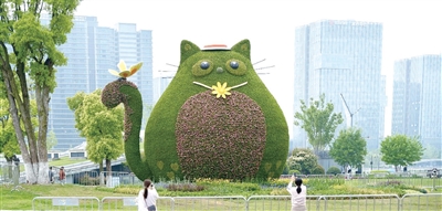 昨天天气好,大猫脚下几乎没断过人。昨天下午,37岁的许女士带着上小学的女儿专程从临平区赶来,她说:“在网上刷到了,很可爱,必须来看看。”也有许多年轻人蹲在花境边上,借着大猫当背景自拍。