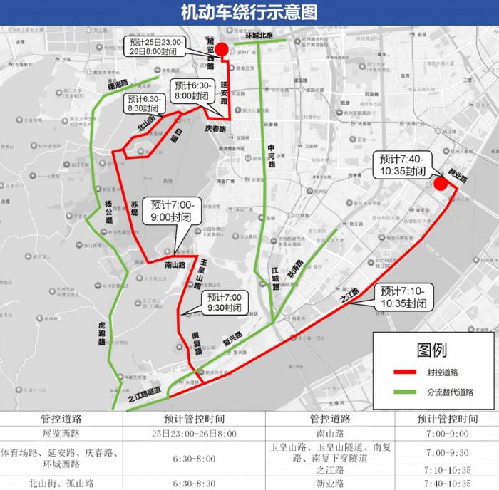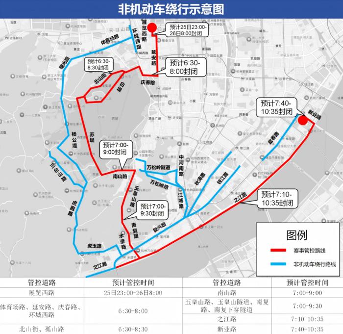 (二)赛道管控措施4月26日6时30分起,赛道体育场路、延安路、庆春路、环城西路、北山街、孤山路采取临时交通管控措施;7时起,赛道南山路、玉皇山路、玉皇山隧道、南复路、南复下穿隧道采取临时交通管控措施;7时10分起,赛道之江路采取临时交通管控措施;7时40分起,赛道新业路采取临时交通管控措施。以上措施实施时,同步在相邻外围道路采取分流措施。