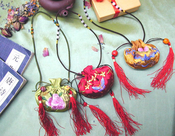 戴香包颇有讲究。老年人为了防病健身,一般喜欢戴梅花、菊花、桃子、苹果、荷花、娃娃骑鱼、娃娃抱公鸡、双莲并蒂等形状的,象征着鸟语花香,万事如意,夫妻恩爱,家庭和睦。小孩喜欢的是飞禽走兽类的,如虎、豹子;猴子上竿、斗鸡赶兔等。青年人戴香包最讲究,如果是热恋中的情人,那多情的姑娘很早就要精心制作一二枚别致的香包,赶在节前送给自己的情郎。小伙子戴着心上人送给的香包,自然要引起周围男女的评论,直夸小伙的对象心灵手巧。 |