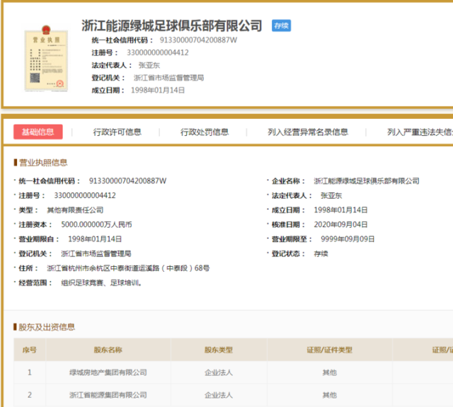 杭+新闻 9月9日,根据国家企业信用信息公示系统显示,浙江绿城足球俱乐部正式更名为浙江能源绿城足球俱乐部。而俱乐部的两大股东中,只剩浙江绿城房地产集团有限公司和浙江省能源集团有限公司,没有了宋卫平的绿城控股集团有限公司和浙江绿城教育投资管理有限公司。