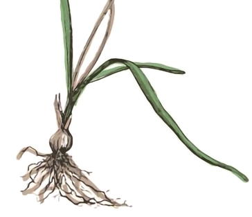 注:【清 吴其濬《植物名实图考》:“老鸦瓣生于田野中,湖北谓之棉花包,固始呼为老鸦头。春初即生,长叶铺地,如萱草而屈曲索结,长至尺余。抽葶开五瓣尖白花,似海栀子而狭,背淡紫,绿心黄蕊,入夏即枯,根如独颗蒜……”。】