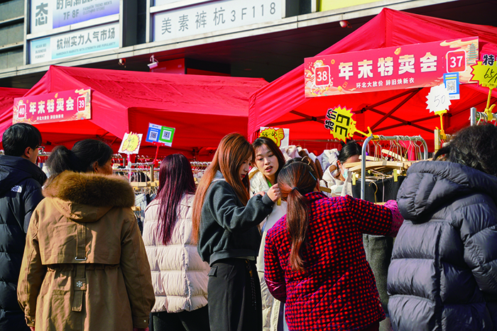 随着杭州多家服装批发市场陆续开启促销,环北丝绸服装城新年特卖会也于昨日拉开帷幕,并将一直持续到2月5日,每天9点到16点营业。昨天下午,记者来到现场,看到在市场南门口摆出了130多个红帐篷摊位,打底背心20元起售,皮草低至100元,羽绒服低至150元,羊毛大衣低至199元,加绒卫衣低至50元,大多以五折或更低的折扣售卖,吸引大量市民争相选购。