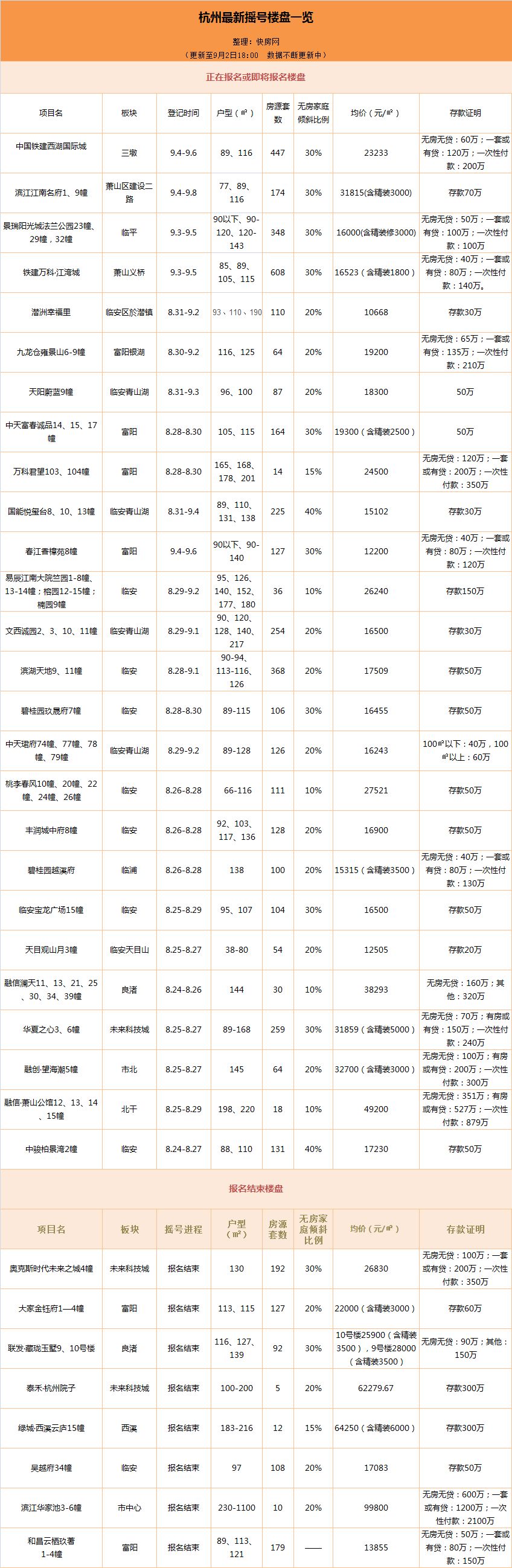 青山湖楼盘现场 图:张巧英 区域内竞争开始呈现“截客”、“拉客”等竞争手段。快房记者本周在青山湖科技城板块采访时,就在当天现场报名登记摇号的文西诚园售楼部门口,碰到附近某楼盘雇佣的拉客人员,向记者和其他一些经过的人热情地发出“邀请”:“我们的楼盘位置更好,性价比更高,就在边上,可以去看看啊!” 推荐阅读 2022亚运会,杭州欢迎你! 杭州姑娘的这封辞职信火了!裸辞七条理由条条扎心 关停的会所门口多了一把椅子?民警一查问题很大 开学第一天 学军、杭二中的校长他们都说些什么 亚奥理事会会旗交接 杭州8分钟惊艳世界 2 曾经的“万人摇”又推房源 位于萧山义桥的中国铁建万科江湾城领出一张新预售证,推出4、5、6、7、11、16幢楼共608套房源,主力户型为85、89、105、115方,房源均价为16523元/平方米,其中装修标准为1800元/平方米,30%比例供无房家庭摇号,报名时间是9月3日-9月5日。中国铁建万科江湾城一直是杭州刚需盘的代表之一,周围的金域兰庭等二手房的挂牌均价大概在28000元/平方米左右,不知道这回会有多少人去报名摇号。 西湖区的中国铁建西湖国际城8月31日领出高层1、2、3号楼共447套房源的预售证,户型89、116方,备案价约21463-24448元/㎡。报名时间是9月4日-9月6日,存款证明的要求是,无房无贷:60万;一套或有贷:120万;一次性付款:200万。