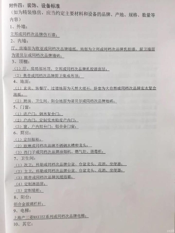 现在,精装修的楼盘越来越多,开发商卖房子精装修是一种趋势,购房者因为精装修问题维权也屡见不鲜。 就在上个周末,某楼盘就出现装修维权,业主认为号称2800元/㎡的装标没有达到实际效果,装修如毛坯。 那么,看着美轮美奂的精装修,实际交付到底会呈现什么呢? 3500元/㎡的精装修都包含了什么 样板房都是假象,等到房子交付时我们才能看到房子最终呈现的样子。 入户门以及门锁是怎样的、厨卫三件套用的是什么品牌、是否有空调新风系统……而确认这些装修配置,我们需要在精装修合同上看。 我们来参考下,一位网友在口水楼市论坛中晒出了一份不知名楼盘的精装修合同,装修标准是3500元/㎡。