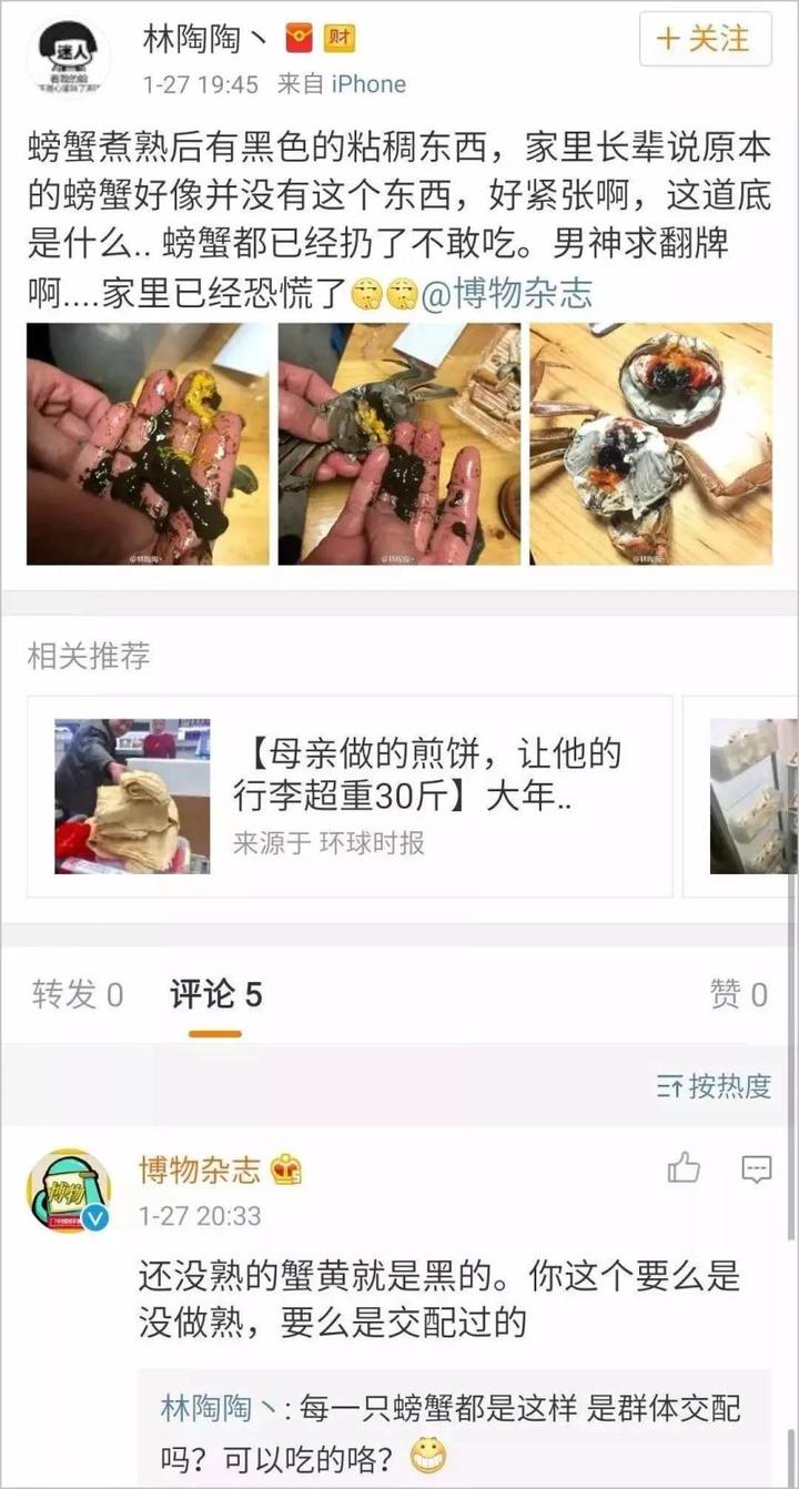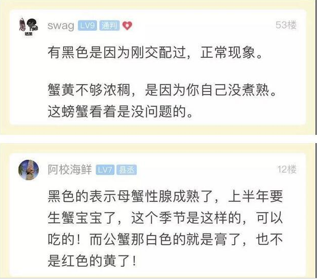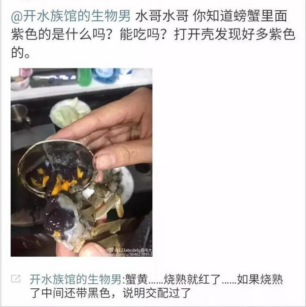 70元一斤的螃蟹,蟹黄里面却分布着一些黑色不明物质? 此前,也有多位网友吃到过这样的螃蟹。 不少网友疑问,这样的螃蟹真的没问题吗,还能吃吗? 其实,这并不是商家黑心、坑人。经查询资料,对蟹黄周围的黑色胶状物质主要有三种解释: 1、加热时间不够 用活母蟹,在加热到10分钟左右,取出切开看一下,蟹黄是中间黑周边黄的,放进锅里继续加热一两分钟后,取出就全是金黄色了,所以应该只是加热时间不够而已。 2、大闸蟹饱食后的胃,即蟹黄中的黑色胶状固体 有生物专家表示,蟹黄旁边的黑色胶状物是螃蟹的胃,也被称为蟹尿包,位于背壳前缘中央,是形如三角形的骨质小包,内有污沙,紧连蟹黄。一般螃蟹在空腹时,胃部会显得比较小,而在饱食过后,胃部胀起,看起来就显得黑色胶状物比较多,但这属于正常范畴,摘除黑色胶状物后即可正常食用。 3、母蟹交配后所产生,黄的黑的界限很明显 蟹黄是体内的卵巢和消化腺,蟹黄体积变大、呈鲜艳的橘黄色时代表母蟹的性腺已经成熟,此时生产排出体外的是蟹卵,留在体内性腺中的卵细胞仍然属于蟹黄的一部分。蟹黄不是螃蟹的卵,但成份和蟹卵基本一致。 知名科普大V@博物杂志、@开水族馆的生物男 给出过类似的解释: