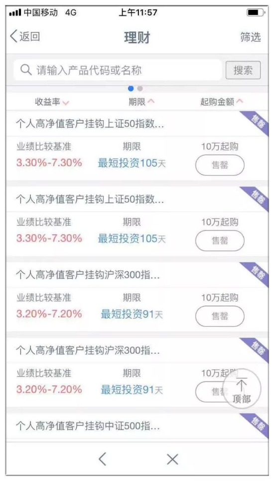 杭州个别银行挂钩股指理财产品卖断货 股指持续走牛正在传导至银行理财市场。今天,杭州一些国有银行挂钩股市的理财产品甚至出现了“卖断货”的情形。打开手机软件,一款10万元起步,挂钩上证50指数的个人高净值客户理财产品已经售罄,该产品的风险等级为PR3级,即风险适中型(往期的业绩比较基准为3.30%-7.30%),不保本不保收益。但在强大的预期赚钱效应下,这类以往并不受投资者追捧的非保本浮动类理财产品,却成了许多投资者眼中的“香饽饽”。 这样的情况绝非个例,除了上述挂钩上证50指数的理财产品,另外几款10万元起步,投资期限为91天、挂钩沪深300指数以及投资期限63天、挂钩中证500指数的理财产品,同样出现了被哄抢一空的情形。 这家国有银行的理财经理告诉记者,“去年股市行情差,挂钩股市的理财产品或者股票型基金基本无人问津,但现在情况完全不同了。2019年以来,指数涨了20%,许多还没‘上车’的投资者都在抢购与股票相关的理财产品,许多新产品出来后经常是我们自己也买不上,只能等着总行补充发行新一期的理财产品。”