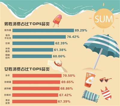 杭州日报 记者 庄郑悦 制图 王璟 进入7月以来,全国各地陆续迎来高温天气,杭州气温更是超过了35℃,虽然近期有降雨可以稍微缓解高温,但仍然抵挡不住“高温热浪”的来袭。 在面对高温天气时,全国各地的小伙伴都是采取什么姿势来降暑降温的?对此,京东大数据研究院发布大数据,对京东平台上高温清凉类的商品进行了分析研究,通过商品的消费大数据和画像数据等,全面解析高温天气下的消费特色。