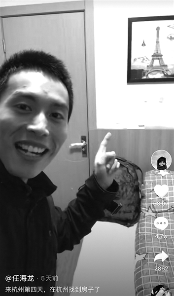 考虑到在大连船厂一直做打磨工的工作并没有发展前途,简单收拾了行李,任海龙从大连飞到了杭州。上月24日,在翁梅附近租好了月租700元的单间后,安顿下来的任海龙拍下了他来杭州后的第一条短视频。就在发布了这条视频的当晚,他在后台收到了杭州很多MCN机构的签约邀请。