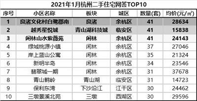 1月份,杭州二手住宅网签TOP10楼盘分别为:良渚文化村白鹭郡南、越秀星悦城、闲林山水紫薇苑、绿城桃源小镇、岸上蓝山公寓、新明半岛、翡翠城一期、青山鹤岭、保利东湾、三墩景溪北苑。