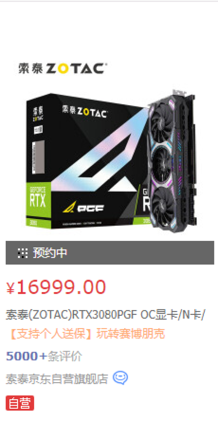比如索泰的RTX3080PGF OC显卡,价格从几天前的18999将至16999。