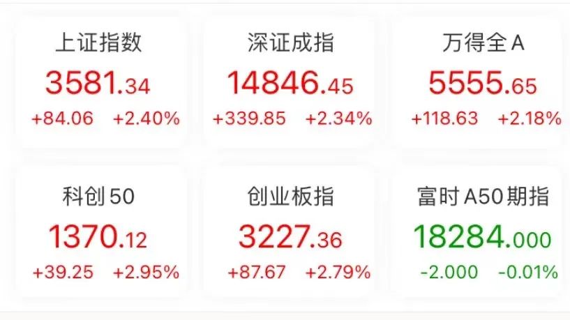 其中,沪指收盘上涨2.40%,深证成指上涨2.34%,创业板指上涨2.79%。