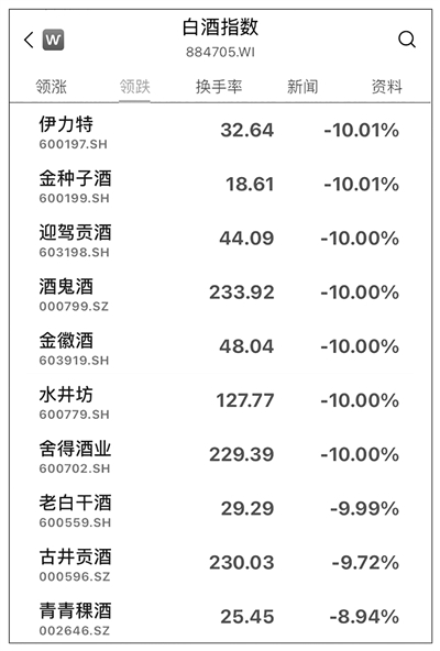 截至昨天收盘,白酒板块跌幅达8.19%,盘中最大跌幅接近9%,距离全板块的跌停仅一步之遥。