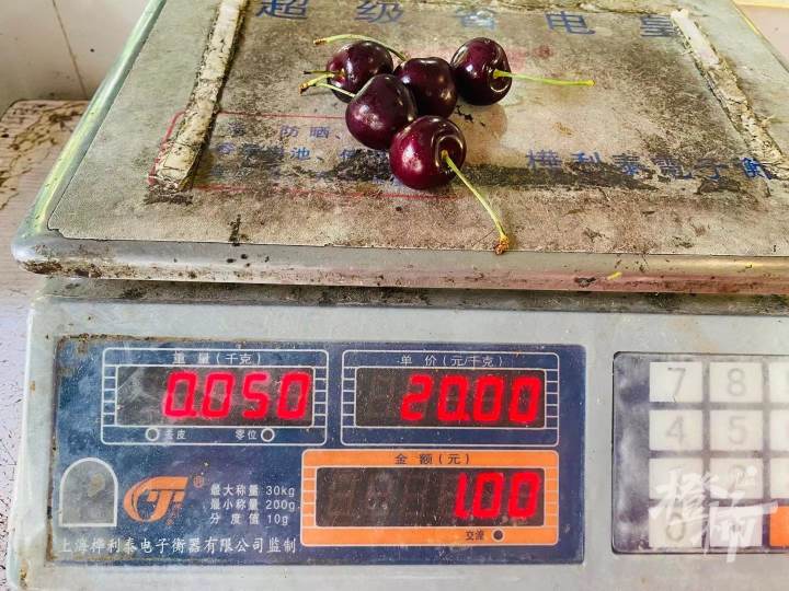 虽然从一箱到一颗的跳跃程度实在太大,毛大姐还是脾气很好地去给我称了。一颗实在太轻,称不出价格,她就放了5颗,一称,正好一两。一斤55元,一两5.5元,5颗樱桃等于平均每颗1.1元。也就是说,一颗约合人民币1754元的“朱诺之心”,可以买差不多1594.5颗拥军水果炒货店的这批樱桃。
