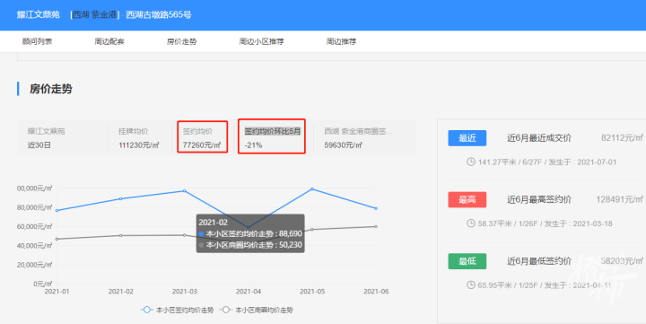 透明售房网的数据显示,耀江文鼎苑近30天的签约均价环比5月要低21%。