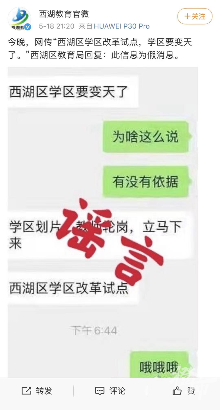不过,西湖区教育局很快就在官方微博发布了辟谣信息,“此信息为假消息”。