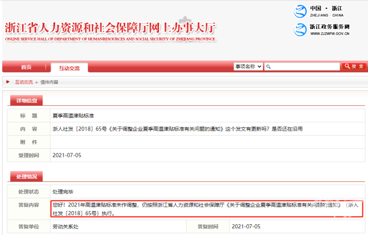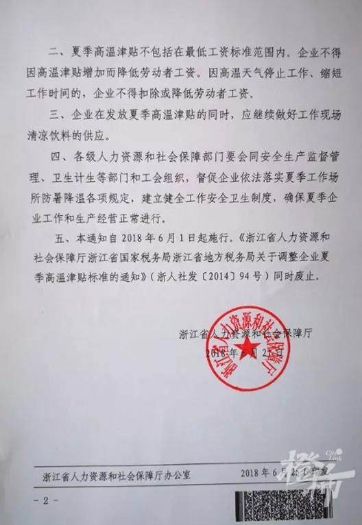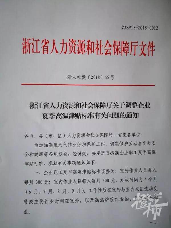 今天,橙柿互动记者通过浙江省人力资源和社会保障厅官网发现,今年,高温津贴依然按照《关于调整企业夏季高温津贴标准有关问题的通知》(浙人社发〔2018〕65号)(简称:《通知》)。