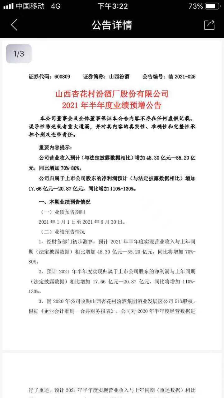此外,和山西汾酒同一天公布中报的另一家酒企——舍得酒业,半年报业绩也十分“逆天”。舍得酒业公告称,“预计公司2021年半年度实现归属于上市公司股东的净利润为7.1亿元-7.5亿元,与上年同期相比增加5.46亿元-5.86亿元,同比增长332.42%-356.78%;预计上半年实现归属于上市公司股东的扣除非经常性损益的净利润为7.03亿元-7.43亿元,同比增长377.42%-404.59%。”今年以来,舍得酒业股价涨幅超过160%。