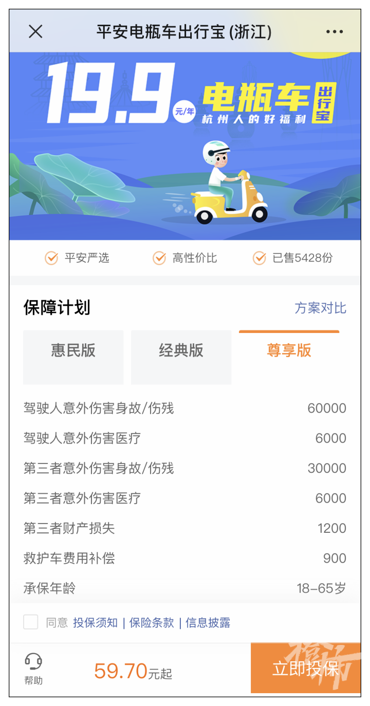 平安产险有一款“电瓶车出行宝”在“杭州市民卡”App上销售,保险责任包括电动自行车驾驶人意外伤害身故/致残、驾驶人意外伤害医疗、第三者意外伤害身故/致残、第三者意外伤害医疗、第三者财产损失、救护车费用补偿等6项保障。