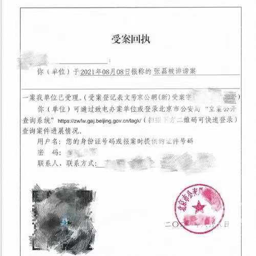 此外,一份受案回执显示,北京警方向报案方反馈说,你(单位)于2021年8月8日报称的张磊被诽谤案一案我单位已受理。