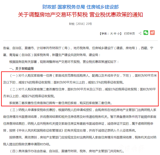 另一方面,实际税率和契税相关法律规定的税率有一定差别,症结在于国家税务总局2016年的规范性文件(财税〔2016〕23号)所作出的减税规定。