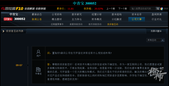 今年以来,受国家严格限制未成年人玩网络游戏时间政策的影响,资本市场中的游戏股受到了较大的打压,包括腾讯、完美世界、掌趣科技等游戏股前期均出现了股价大幅下滑的走势。近日,国家新闻出版署下发了《关于进一步严格管理 切实防止未成年人沉迷网络游戏的通知》,明确限制18岁以下的未成年人每天玩网络游戏的时间为1个小时,且这1个小时还明确必须在每周五、周六及周日,以及公共假期的晚上8-9点上线。“元宇宙”概念的横空出世能否扭转投资者对于游戏产业的悲观预期?还是以中青宝为例,2018年-2020年,公司归母净利分别为3636万元、5172万元、-1.35亿元。今年上半年归母净利达1154.73万元,同比增长30.31%。业内人士指出,中青宝希望借助元宇宙换来“第二春”,但业务发展仍存在不确定性。在中青宝的投资者互动平台上,有投资者直接向公司董秘提问有关“元宇宙”的问题。