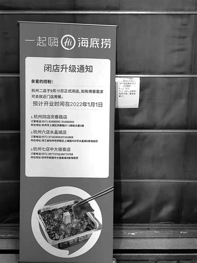 昨天下午,记者赶到绍兴路的海底捞门店,从该店立在门口的通知可以看到,自今年9月15日起,这里就“闭店升级”了,预计将于2022年1月1日重新开业。
