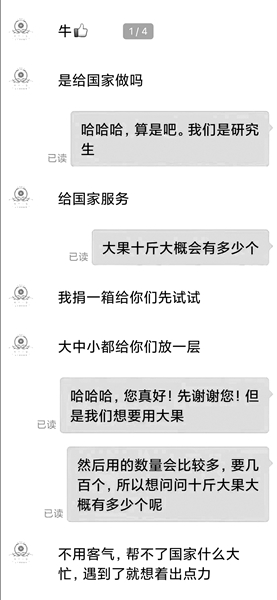 难以想象、受宠若惊……在接受多家媒体采访时,陈凯表达了同样的感受。上周四下午,他的店铺迎来了一位浙大博士生肖小娥,对方想要买点橘子做实验,问了一些问题,“当时我也就是随口问了一句,是给国家做吗?她回答是的。”