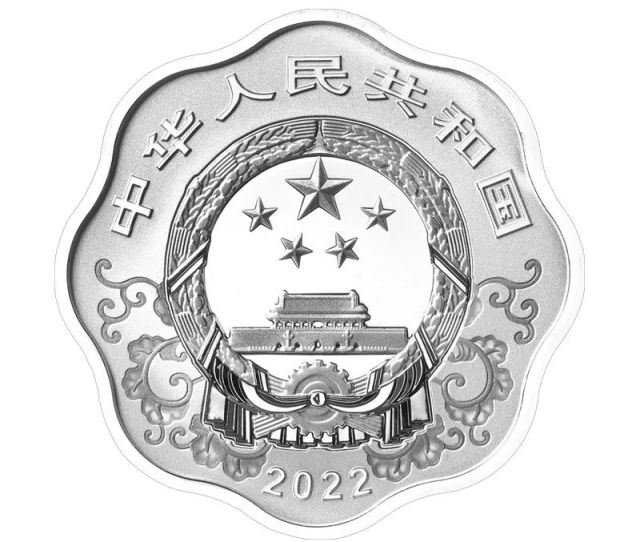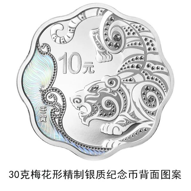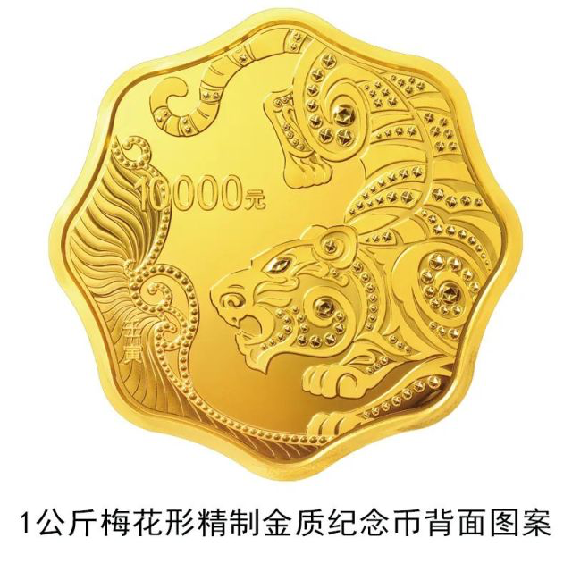 1公斤梅花形金质纪念币和30克梅花形银质纪念币背面图案均为装饰风格虎造型,衬以装饰纹样。