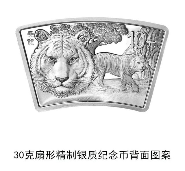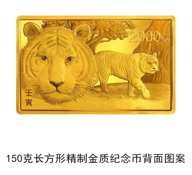 150克长方形金质纪念币和30克扇形银质纪念币背面图案均为行走中的虎与特写虎头造型,衬以树木、山水等设计元素。