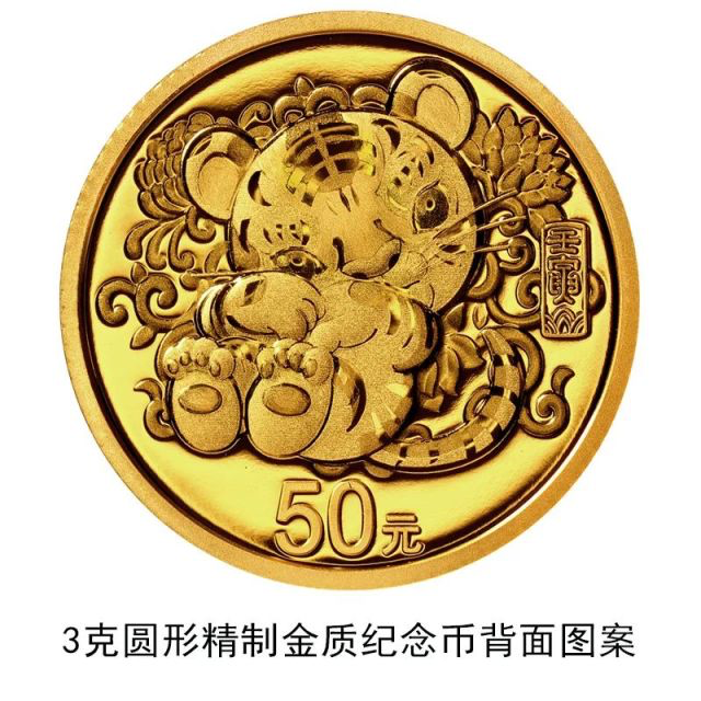 3克圆形金质纪念币和15克圆形银质纪念币(彩色)背面图案均为卡通风格小虎造型,衬以吉祥花卉等装饰。