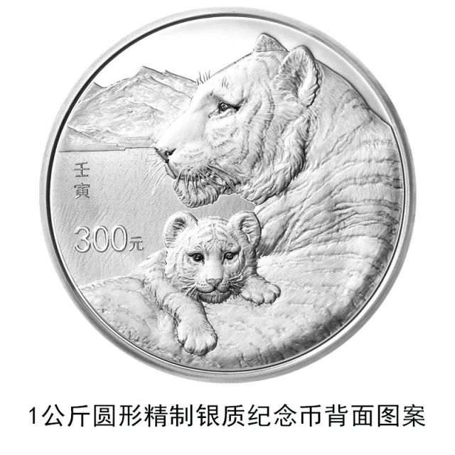 10公斤圆形金质纪念币、2公斤圆形金质纪念币和1公斤圆形银质纪念币背面图案均为写实风格母子虎造型,衬以远山等设计元素。