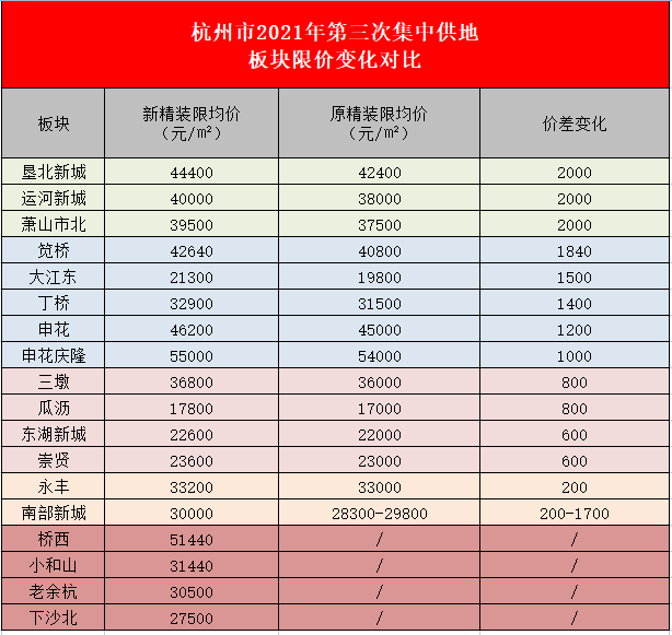 本次调整变化最大的是垦北新城、运河新城、萧山市北三个板块。除此之外,笕桥、大江东、丁桥、申花等板块,调整幅度也很大。而从限价变化来看,大江东变化最大,从原先精装限价19800元/㎡调整为21300元/㎡,幅度达7.6%。