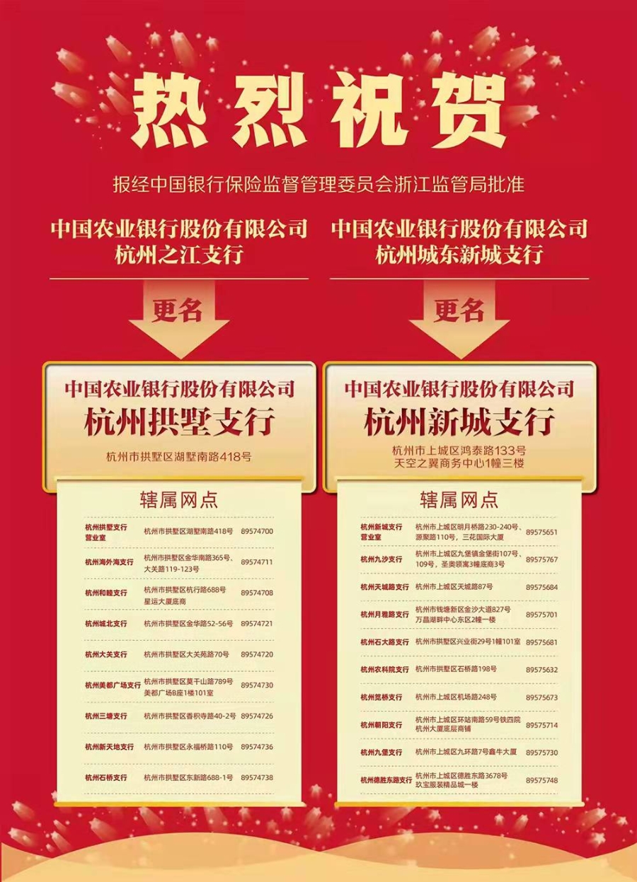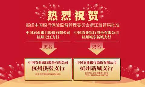 为更好顺应区划调整、服务区域经济,由原农行杭州之江支行更名的农行杭州拱墅支行,原农行杭州城东新城支行、九堡支行两家一级支行合并而成的农行杭州新城支行今日正式挂牌成立。