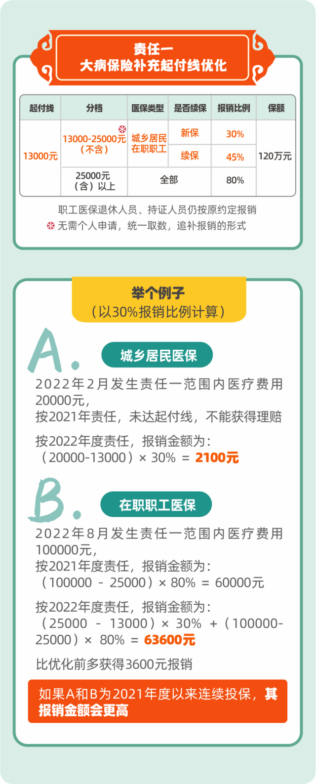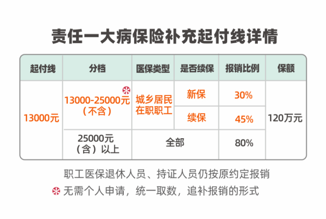 其中责任一(大病保险补充医疗保障)中城乡居民和在职职工起付线从2.5万元降至1.3万元,预计将增加超过5万市民受益。