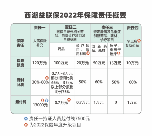 此外,2022年度国家医保目录准入谈判结束后,“西湖益联保”责任三(特定肿瘤及危重症创新药品、耗材、诊疗项目医疗保障)原有的38种特药中,有16种将进入医保目录,因此,“西湖益联保”调出这16种特药,同时新增18种,包括治疗白血病的“倍利妥”“唯可来”、治疗肺癌的 “普吉华”“沃瑞沙”、治疗肝癌的“达攸同”等。2022年度责任三特药也由38种增至40种。