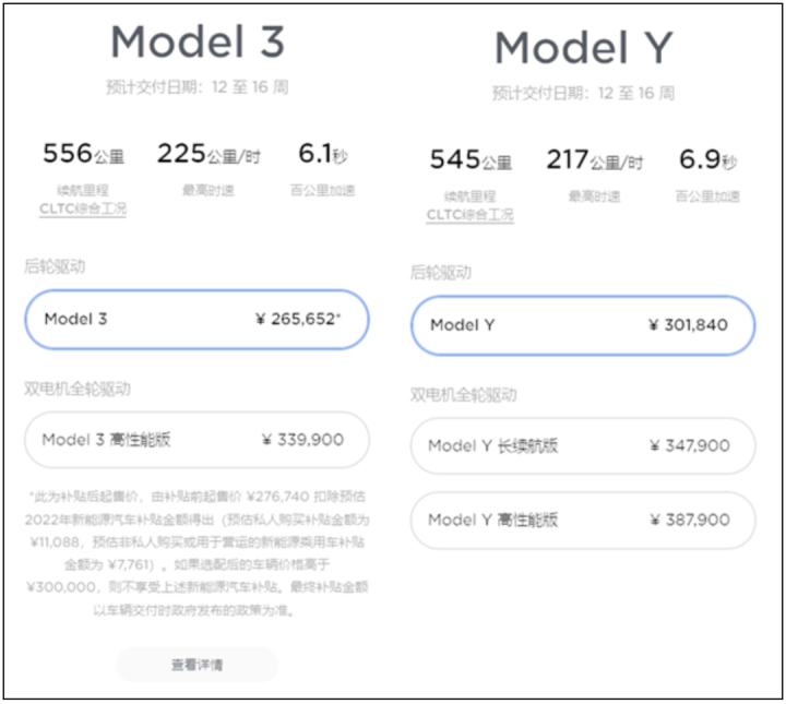 倒是特斯拉反应最快。特斯拉在元旦前就提前上调了Model 3和Model Y两款车型的后轮驱动版价格,涨幅分别为1万元和2.1万元,其中Model Y价格上涨后,全系售价将高于30万,按照标准无法享受国家补贴政策。目前整个特斯拉产品序列里,仅剩Model 3后轮驱动版一款车型能够享受新能源汽车补贴。