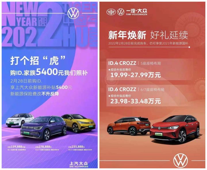 和造车新势力相比,传统车企的新能源车价格相对比较稳定,目前基本上都没有上调。其中一汽-大众和上汽大众针对旗下ID.系列电动车都推出了延期享受补贴的政策,消费者在2月28日前购车,可以继续享受2021年的补贴政策,差额由厂家补足。在两家车企的官网上,ID.6 CROZZ、ID.4 CROZZ和ID.6X、ID.3的价格目前均没有变化。