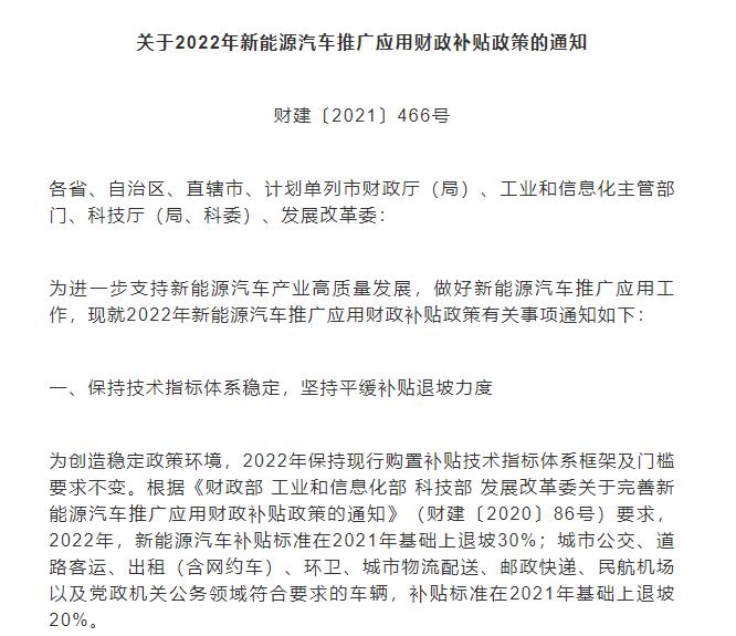 2021 年 12 月 31 日,财政部、工信部、科技部、发改委等四部委联合发布《关于 2022 年新能源汽车推广应用财政补贴政策的通知》(以下简称《通知》)。根据该《通知》,2022年新能源汽车补贴标准在2021年基础上退坡30%。2022年新能源汽车购置补贴政策将于2022年12月31日终止,2022年12月31日之后上牌的车辆不再给予补贴。换句话说,今年是购买新能源车享受补贴的最后一年。