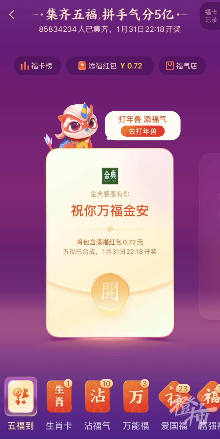支付宝的集五福,走到了第7年。今年的奖金池是5亿元,截至25日上午10点半,已有超8500万人集齐五福,开始进入“打年兽”积攒“添福”红包阶段。