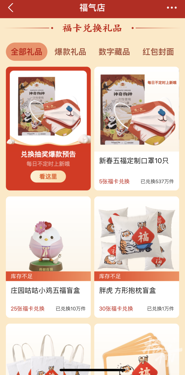 对许多人来说,今年的支付宝集五福还有个非常实用的玩法:多余的福卡可在福气店里兑换定制礼品,像是五福定制口罩、盲盒、抱枕、数字藏品、红包封面、虎年专属头像等。这些都是实打实的福利,而且门槛低,就是需要拼手速。