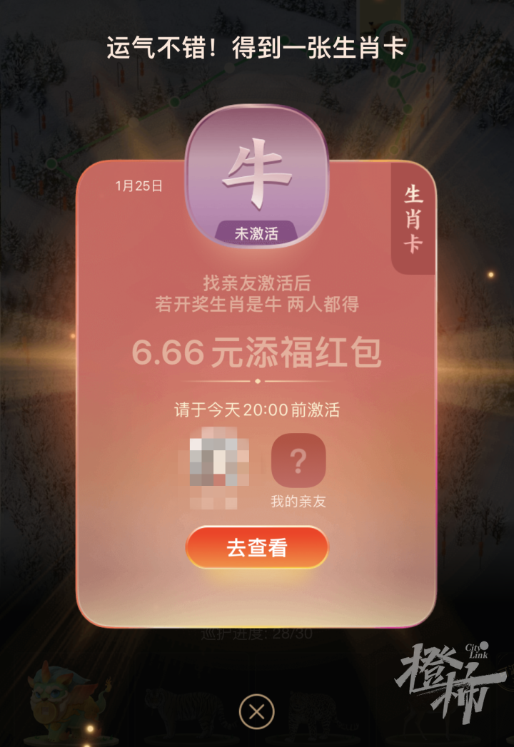 还有人乐此不疲地玩起了生肖卡。怎么玩?简单说,领到生肖卡后邀请一位朋友激活,然后等待当天晚上8点直播开奖。如果你的生肖中奖,那么你和你的朋友都可以得到6.66元。