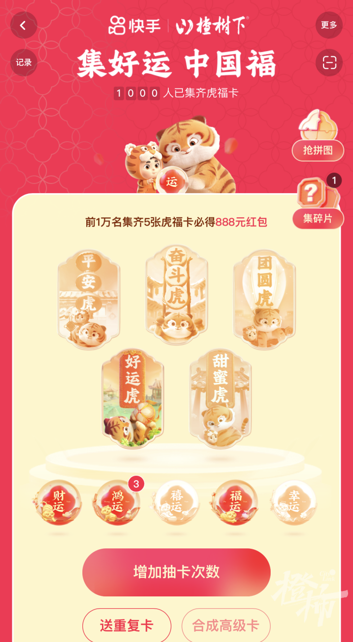 前1万名集齐好运卡,会获得666元早鸟红包;集齐虎福卡的前1万名可获得早鸟红包888元。截至上午10点半,已有1000人集齐虎福卡。
